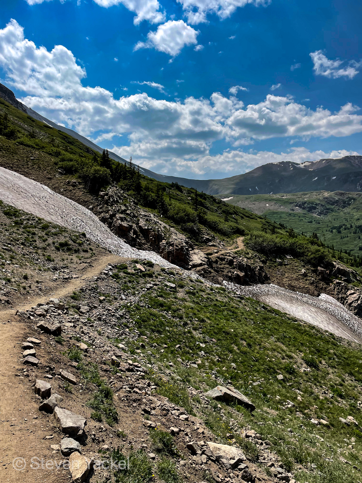 Depending on the time of the year you can have a snow crossing along the trail.  This snow crossing is engrained in my memories of the hike as a child.  In July there was still a small spot where snow covered the trail, although it was much smaller than I had remembered.  The little mountain streams that take the melting snow to the lakes below make music as they babble and trickle down the hillside.